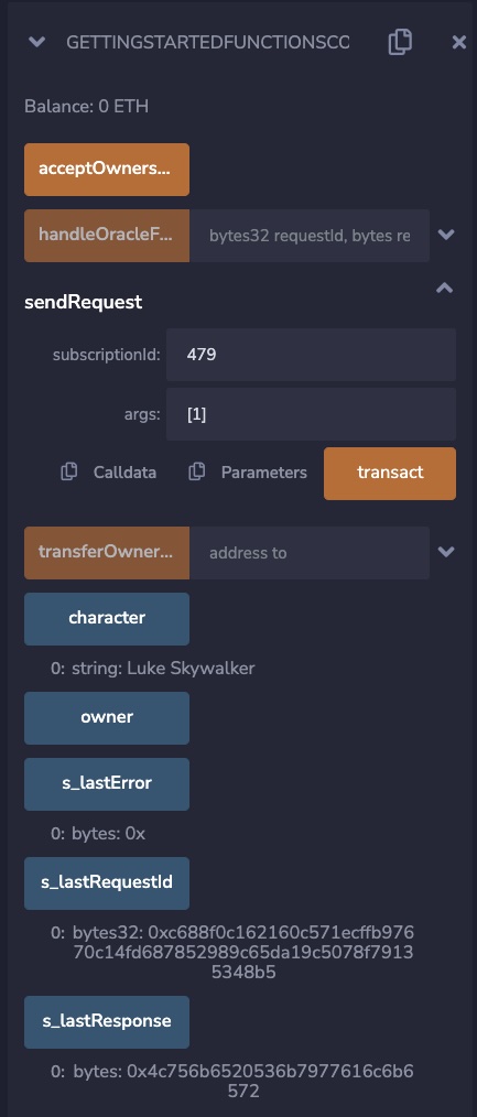 7. After the status is Success, check the character name. In Remix, under the Deploy & Run Transactions tab, click the character function. If the transaction and request ran correctly, you will see the name of your character in the response.